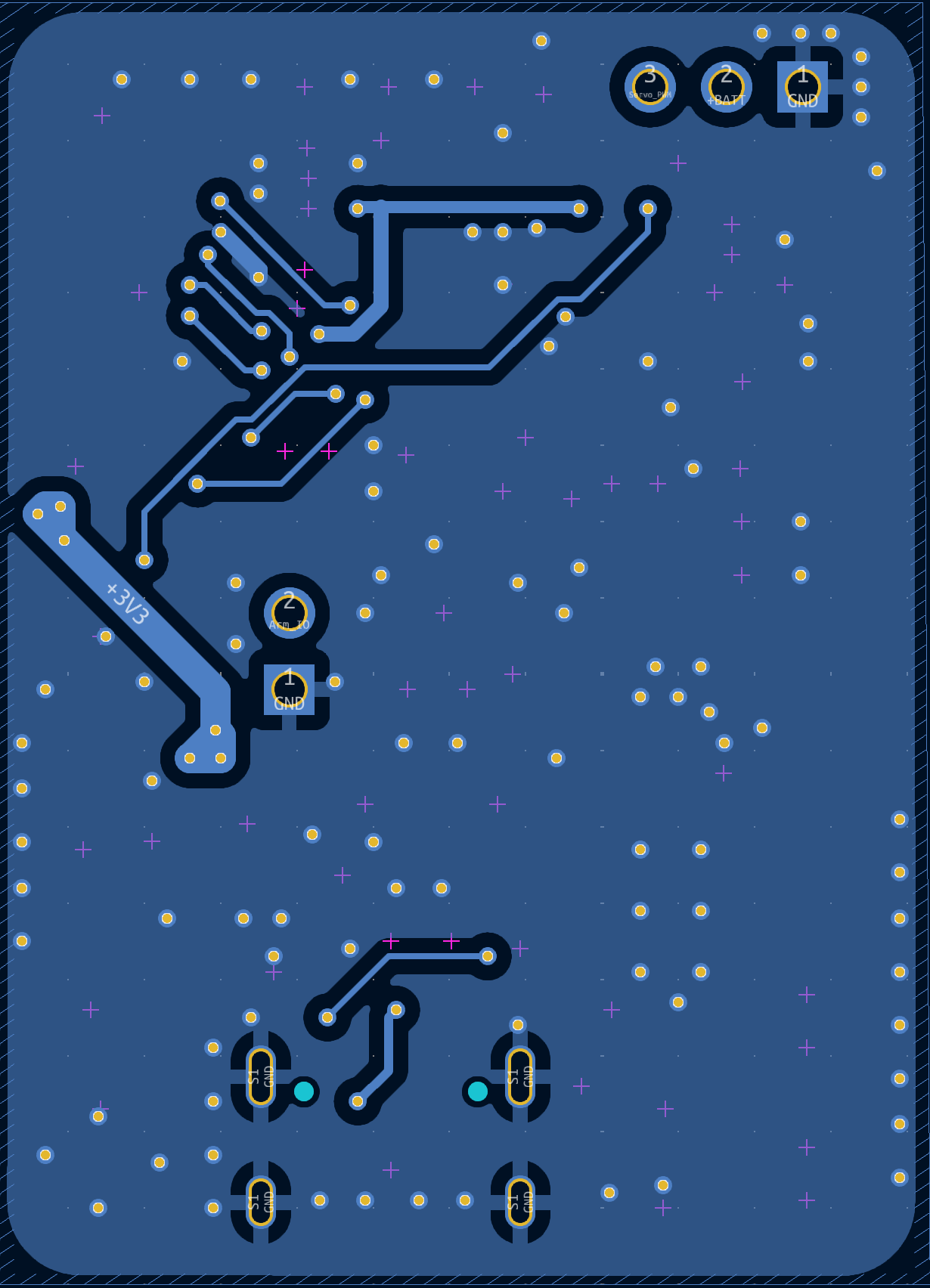 This board uses components almost exclusively from JLCPCB's Basic Parts catalog. I wanted to see how low I could get the cost of this board because it was my first attempt at PCB design, and they would need to undergo extensive acceptance testing for our payload system. Those parts were used along with single-sided assembly, two layers, and easily manufacturable via sizes. This yielded a cost of less than $15 per board including assembly fees.
