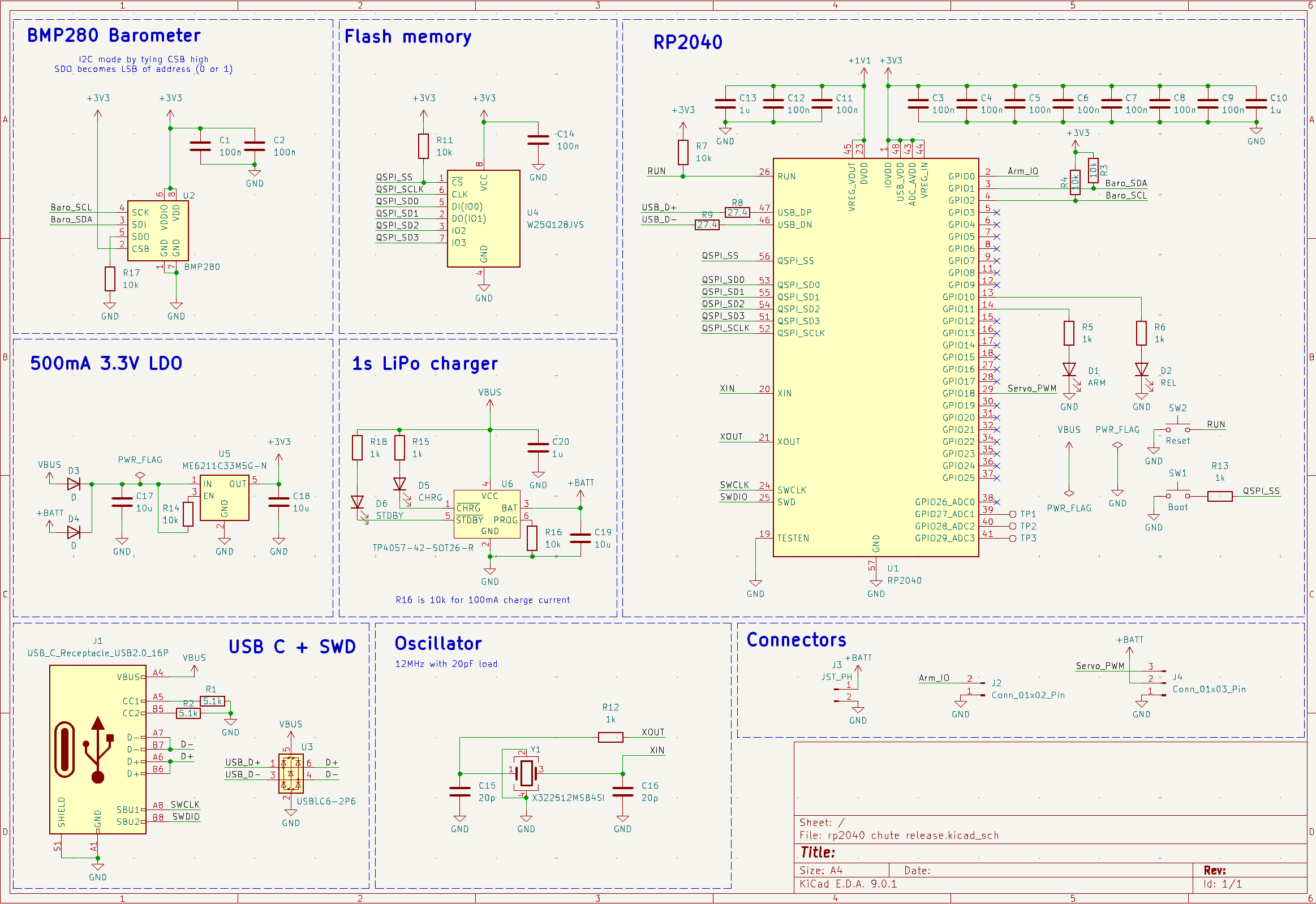 The I2C bus between the RP2040 and the BMP280 were the only sources of trouble for this board. I had forgotten the pullup resistors on it, so I hand-soldered pullups to a nearby 3V3 pad. The next issue was firmware related. I had selected the wrong pads to use for hardware I2C on the RP2040, so the Arduino IDE was impossible to use with it, even after attempting to recompile the libraries with software I2C support. In the end, I used MicroPython to successfully program the board.
